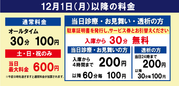 利用者の皆さまに駐車料金をご負担いただくこととなりますが、駐車場混雑を緩和し、駐車場利用者の利便性の向上を図る為の措置ですので、何卒ご理解・ご協力を賜りますようお願い申し上げます。
